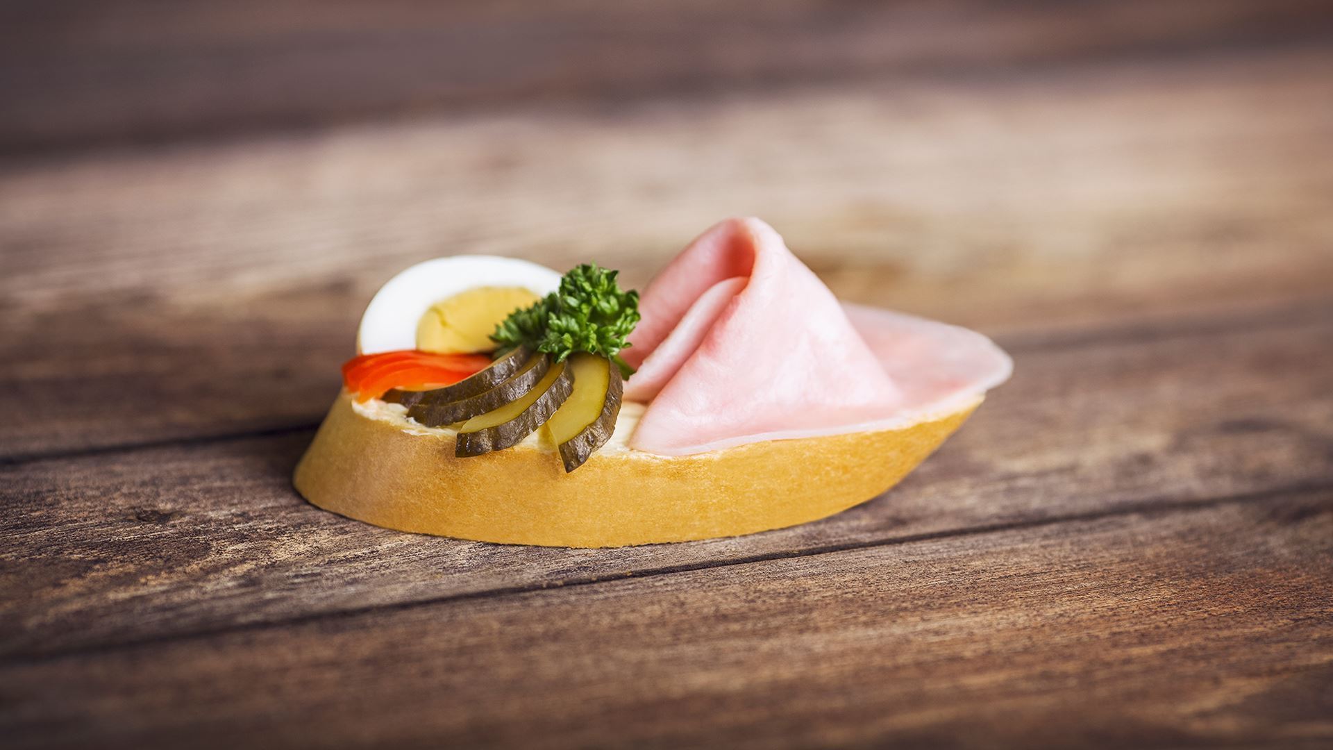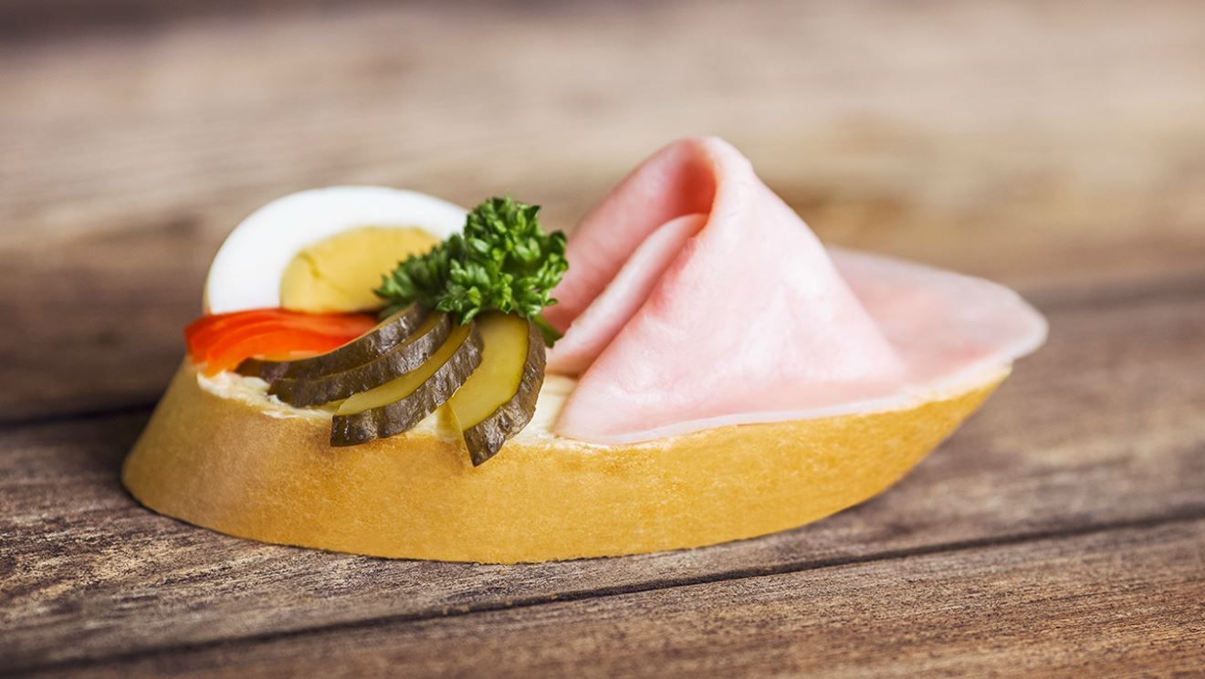 veka [pšeničná mouka, voda, rostlinný tuk ztužený (palmový a řepkový olej v různém poměru), emulgátor (E471), kyseliny (mléčná, citronová, sorbová), antioxidanty (E310, E311), máslové aroma), droždí, sůl], máslo, šunka standart 23 % [vepřová kýta, voda, sůl, konzervant (dusitan sodný), stabilizátory (difosfrečnany, trifosforečnany sodné a draselné), zahušťovadla (E407a, E415), cukr, antioxidant (E316, E301)], máslo, vejce vařené, sterilovaná zelenina [okurka, kapie, konzervanty (benzoan sodný, sorban draselný)], majonéza (řepkový olej, voda, vaječné žloutky sušené, ocet kvasný lihový, cukr, sůl), petržel.