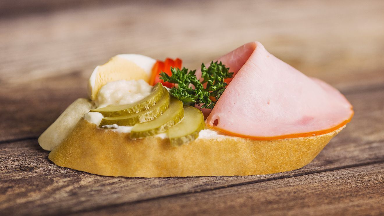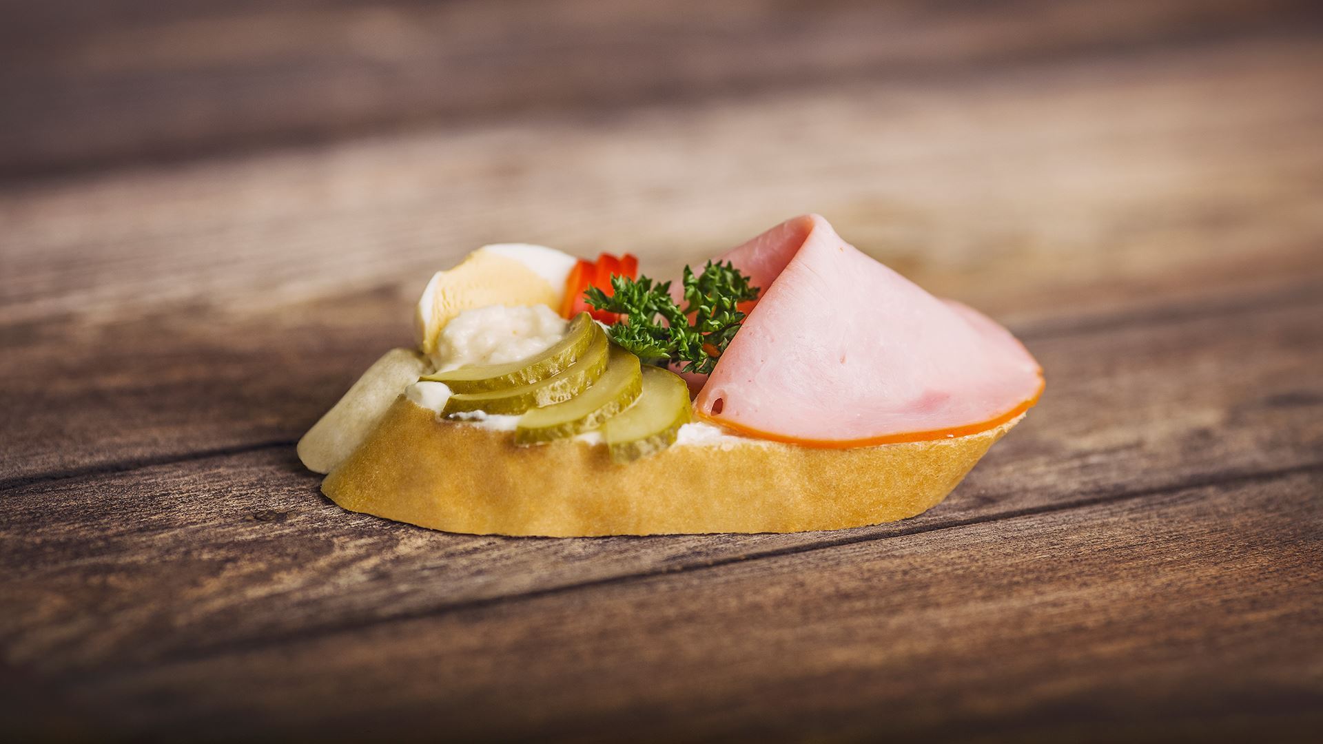 pažitková pomazánka {tvaroh 60 %, majonéza [řepkový olej, voda, modifikované škroby, vaječný žloutek sušený, stabilizátory (karubin, guma guar, xanthan), ocet kvasný lihový, cukr, sůl] cibule, pažitka 2 %, sůl, regulátor kyselosti (citronan sodný), konzervanty (sorban draselný, benzoan sodný}, veka [pšeničná mouka, voda, rostlinný tuk ztužený (palmový a řepkový olej v různém poměru), emulgátor (E471), kyseliny (mléčná, citronová, sorbová), antioxidanty (E310, E311), máslové aroma), droždí, sůl], debrecínka 18 % [vepřové maso, voda, bramborový škrob, sůl, dextróza, cukr, aroma, glukózový sirup, maltodextrin, stabilizátory (difosforečnany), zahušťovadla (E417, E407a), antioxidant (E316), barvivo (košenila), regulátor kyselosti (E525), konzervant (dusitan sodný)], vejce vařené, sterilovaná okurka, sterilovaná kapie, sterilovaný křen [konzervant (disiřičitan draselný)], petržel.