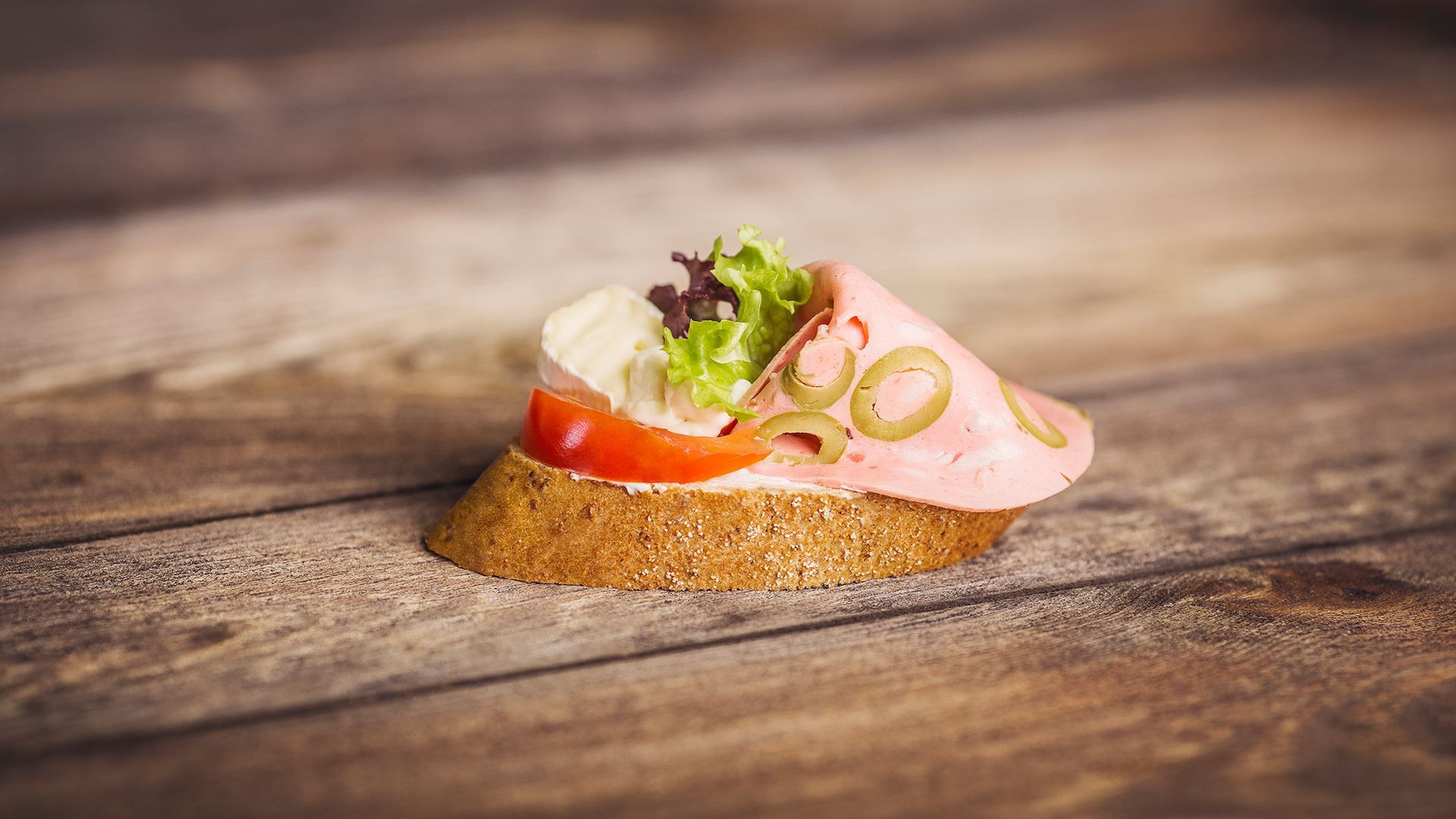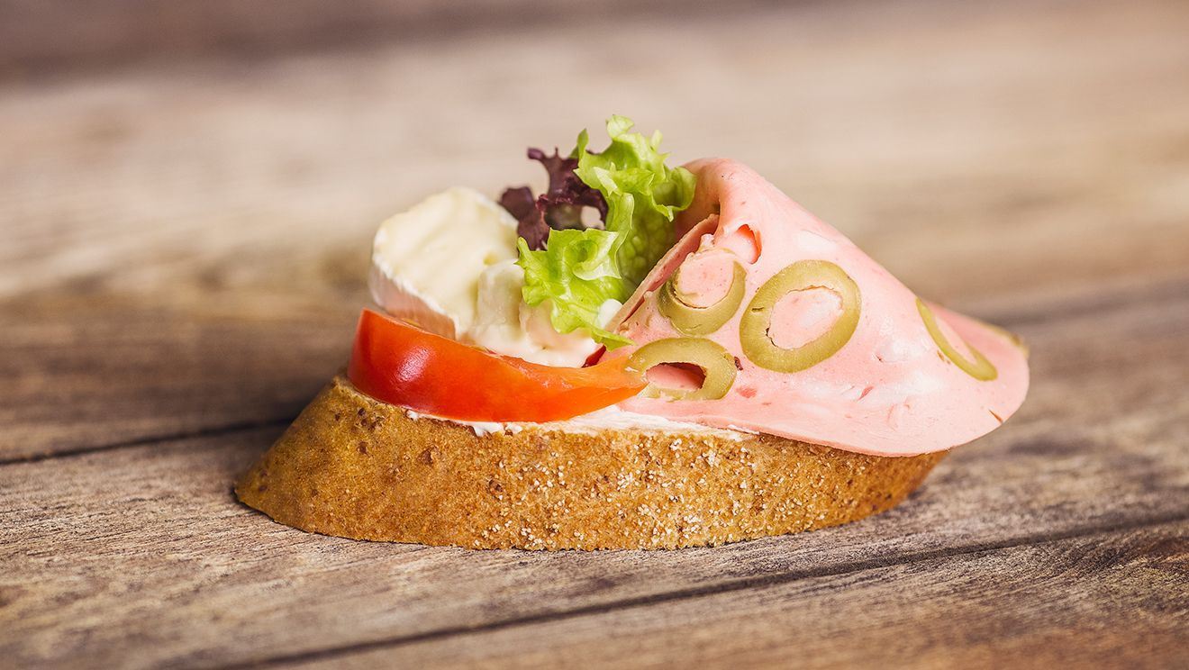 pečivo vícezrnné 23 % [pšeničná mouka, voda, vícezrnná směs (sojový šrot, žitná mouka, lněné semínko), droždí, rostlinný tuk ztužený (palmový a řepkový olej v různém poměru), emulgátor (E471), kyseliny (mléčná, citronová, sorbová), antioxidanty (E310, E311), barviva (annatto, kurkumin, máslové aroma), cukr, sladová moučka, sůl], pomazánka s křenem [zakysaná smetana, rostlinný olej (palmový, kokosový v různém poměru), sušené mléko, sterilovaný křen, konzervant (disiřišitan sodný), bramborový škrob, sůl, sušená syrovátka], mortadela s olivami 17 % [vepřové maso, vepřové sádlo, voda, olivy 15 %, bramborový škrob, stabilizátor (guma guar, karagenan, karubin, difosforečnany), sůl, aroma, koření, barvivo (košenila), dextróza, cukr, antioxidant (E316), česnek, konzervant (dusitan sodný)], sýr hermelín (mléko, mlékárenské kultury, sůl, Penicillium candidum), rajče, salát, tavený SÝR [přírodní sýr (mléko, sůl, mléčné kultury, barvivo (karoteny), voda, máslo, sušené mléko, tavicí soli (E452, E339)].