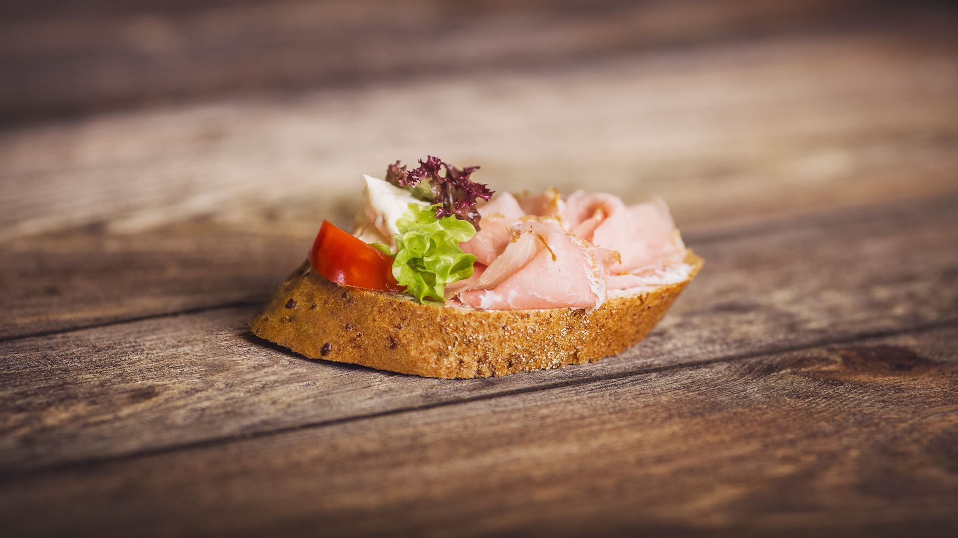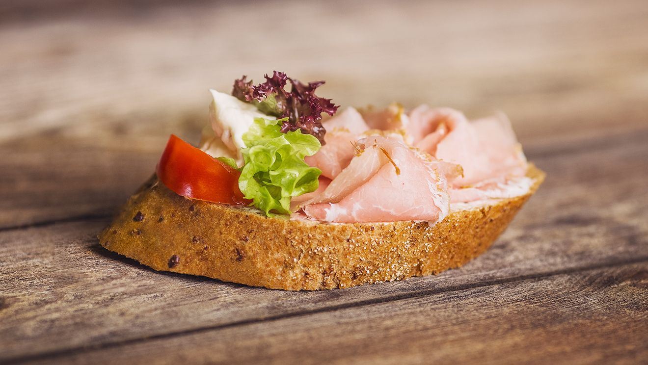 pečivo vícezrnné 23 % [pšeničná mouka, voda, vícezrnná směs (sojový šrot, žitná mouka, lněné semínko), droždí, rostlinný tuk ztužený (palmový a řepkový olej v různém poměru), emulgátor (E471), kyseliny (mléčná, citronová, sorbová), antioxidanty (E310, E311), barviva (annatto, kurkumin, máslové aroma), cukr, sladová moučka, sůl], pomazánka [zakysaná smetana, rostlinný olej (palmový, kokosový v různém poměru), sušené mléko, bramborový škrob, sůl, sušená syrovátka], sušená pečeně pršut 21 % [vepřové maso, jedlá sůl, konzervant (dusitan sodný)], rajče, salát, tavený sýr [přírodní sýr (mléko, sůl, mléčné kultury, barvivo (karoteny), voda, máslo, sušené mléko, tavicí soli (E452, E339)].