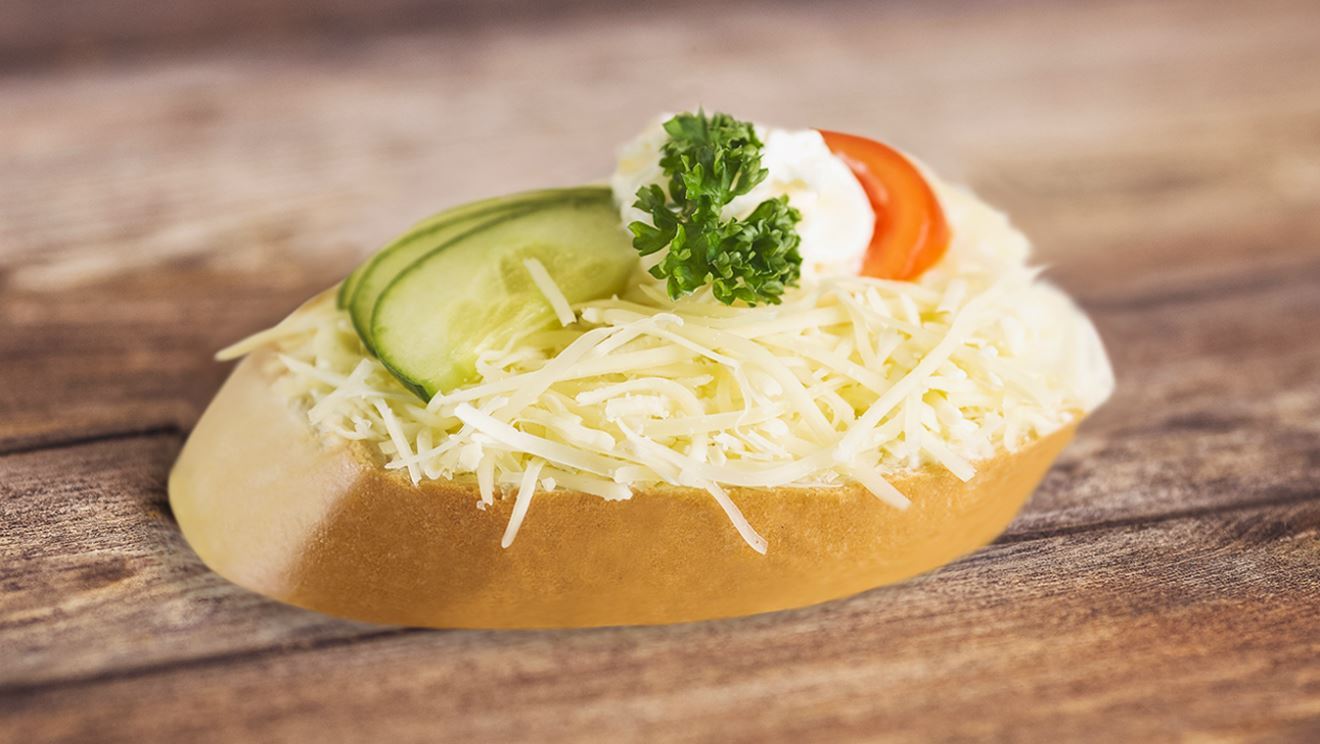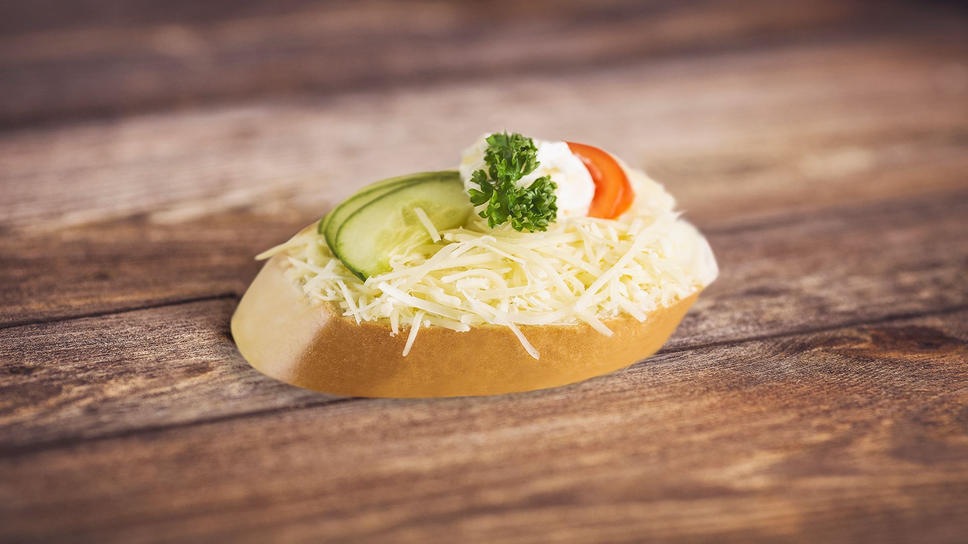 pažitková pomazánka {tvaroh 60 %, majonéza [řepkový olej, voda, modifikované škroby, vaječný žloutek sušený, stabilizátory (karubin, guma guar, xanthan), ocet kvasný lihový, cukr, sůl] cibule, pažitka 2 %, sůl, regulátor kyselosti (citronan sodný), konzervanty (sorban draselný, benzoan sodný}, veka [pšeničná mouka, voda, rostlinný tuk ztužený (palmový a řepkový olej v různém poměru), emulgátor (E471), kyseliny (mléčná, citronová, sorbová), antioxidanty (E310, E311), máslové aroma), droždí, sůl], sýr eidam 20 % (pasterované mléko, mlékárenské kultury, sůl), rajče, majonéza (řepkový olej, voda, vaječný žloutek sušený, ocet kvasný lihový, cukr, sůl), okurka, petržel.