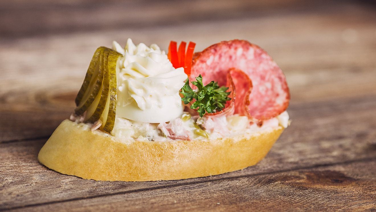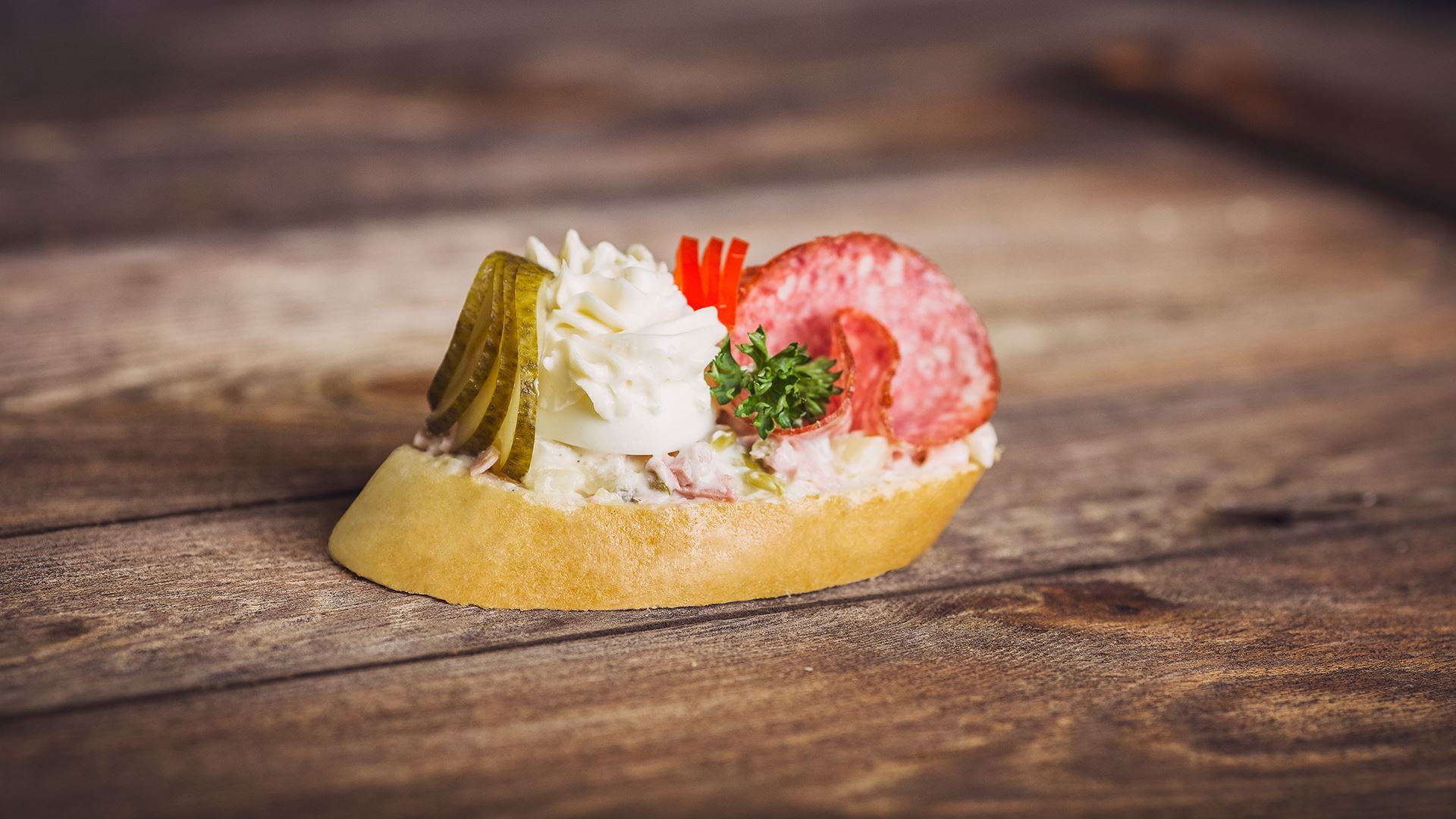 vlašský salát 35 % [vlašský salát [majonéza (řepkový olej, voda, vaječné žloutky sušené, ocet kvasný lihový, cukr, sůl), salám junior 25 % [vepřové maso, voda, vepřové kůže, bramborový škrob, jedlá sůl, bambusová vláknina, vepřová bílkovina, dextróza, koření, extrakty koření, stabilizátor (E450), antioxidant (E300), regulátor kyselosti (E330), barviva (E120, E101), konzervant (dusitan sodný)], brambory vařené , sterilovaná zelenina (okurky, mrkev, hrášek, celer), cukr, hořčice (voda, hořčičné semeno, ocet kvasný lihový, cukr, sůl, koření), ocet kvasný lihový, sůl, worcestrová omáčka (bíle víno, barvivo karamel, rajčatový protlak, švestková povidla, aroma, sušená zelenina, koření a jeho výtažky), regulátor kyselosti (citronan sodný), konzervanty (sorban draselný, benzoan sodný), pepř mletý], šunka standart 18 % [vepřová kýta, voda, sůl, konzervant (dusitan sodný), stabilizátory (difosfrečnany, trifosforečnany sodné a draselné), zahušťovadla (E407a, E415), cukr, antioxidant (E316, E301)], veka [pšeničná mouka, voda, rostlinný tuk ztužený (palmový a řepkový olej v různém poměru), emulgátor (E471), kyseliny (mléčná, citronová, sorbová), antioxidanty (E310, E311), máslové aroma), droždí, sůl], vejce vařená 19 %, majonézový přeliv (voda, řepkový olej, vaječné žloutky sušené, ocet kvasný lihový, cukr, sůl), turistický salám [vepřové maso, hovězí maso, vepřové kůže, voda, sůl, dextrin, kvasnicový extrakt, koření, dextróza, stabilizátory (difosfrečnany, trifosforečnany sodné a draselné), antioxidant (askorban sodný), látka zvýrazňující chuť a vůni (glutaman sodný), konzervant (dusitan sodný), barvivo (košenila)], sterilovaná okurka, sterilovaná kapie, petržel.