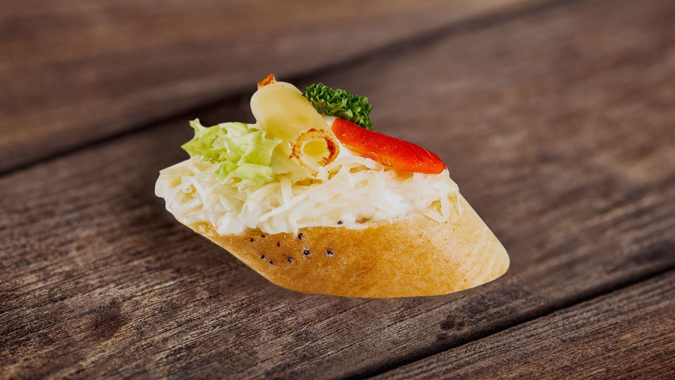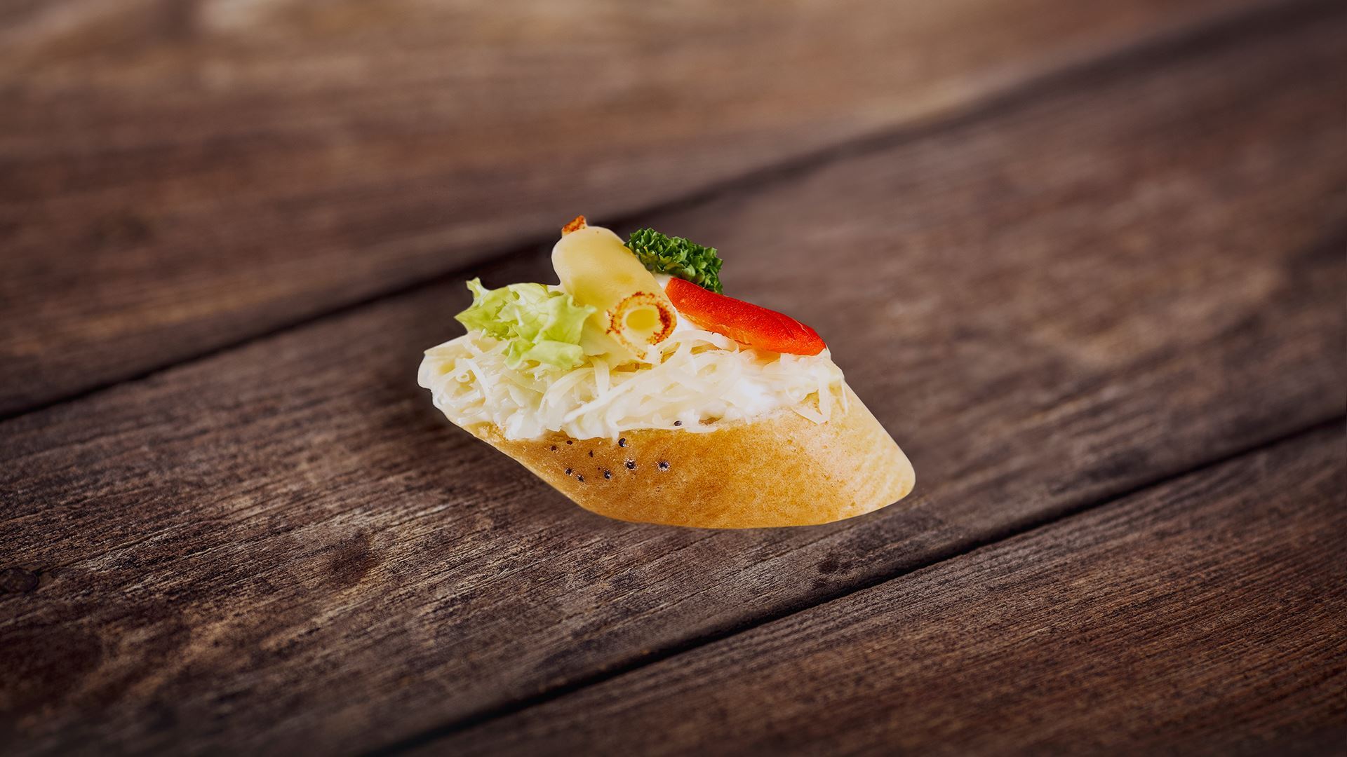 Pomazánka česneková se sýrem 62 % [majonéza (řepkový olej, voda, VAJEČNÉ ŽLOUTKY sušené, ocet kvasný, cukr, jedlá sůl), SÝR eidam 23 % (pasterované MLÉKO, MLÉKÁRENSKÉ kultury, barvivo: annato), tavená pomazánka 22 % [voda, SÝRY, směs rostlinných olejů v různém poměru (palmový, řepkový, kokosový, SOJOVÝ, slunečnicový), TVAROH, sušená SYROVÁTKA, tavící soli: E450, E452, E339, stabilizátor: E415, E407, sůl, regulátor kyselosti: E330], česnek 5 %, voda, regulátor kyselosti: citronan sodný, konzervanty: sorban draselný, benzoan sodný], pšeničné pečivo 25 % [(PŠENIČNÁ MOUKA, pitná voda, rostlinný olej řepkový, pekařské droždí, jedlá sůl, zlepšující přípravek (PŠENIČNÁ MOUKA, enzymy, látka zlepšující mouku: kyselina askorbová) posyp: jedlá sůl, mák], sterilovaná kapie, oliva, petržel.