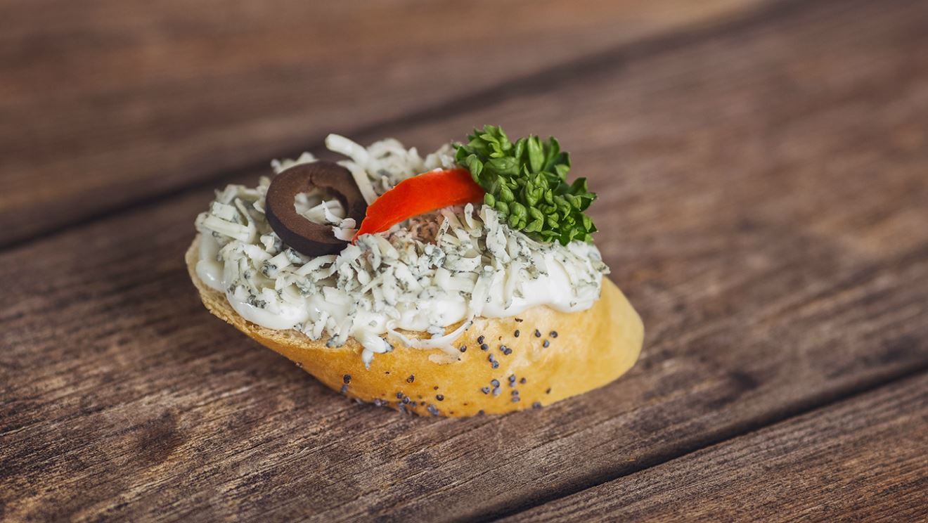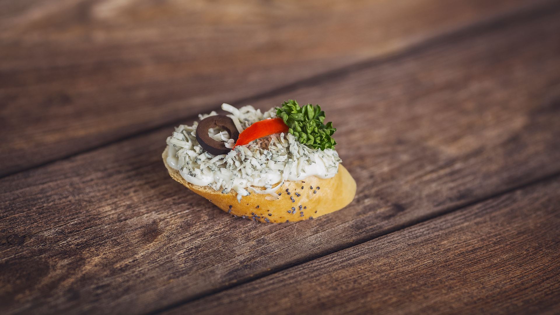 Pomazánka třená niva 53 % [SÝR niva 30 % (MLÉKO, jedlá sůl, MLÉKÁRENSKÉ kultury, Penicillium roqueforti), tavený SÝR (SÝRY, MÁSLO, MLÉKO, TVAROH, tavicí sole: E452, E450, voda), majonéza (řepkový olej, voda, VAJEČNÉ ŽLOUTKY sušené, ocet kvasný, cukr, jedlá sůl), TVAROH MĚKKÝ], pšeničné pečivo 21 % [(PŠENIČNÁ MOUKA, pitná voda, rostlinný olej řepkový, pekařské droždí, jedlá sůl, zlepšující přípravek (PŠENIČNÁ MOUKA, enzymy, látka zlepšující mouku: kyselina askorbová) posyp: jedlá sůl, mák], SÝR niva 17 %, oliva, paprika, petržel.