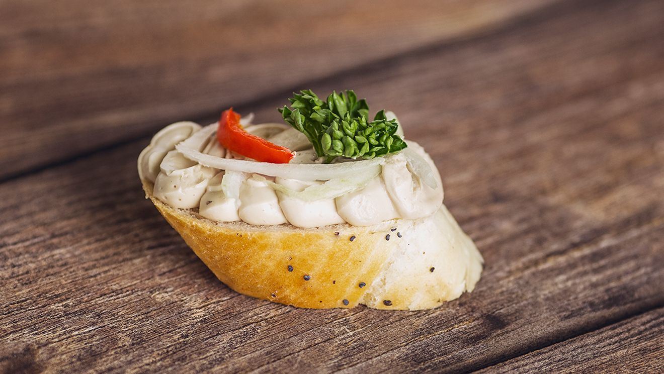 SARDELOVÁ pomazánka 62 % [MÁSLO, SARDEL obecná (Engraulis encrasicholus), jedlá sůl)], pšeničné pečivo 25 % [(PŠENIČNÁ MOUKA, pitná voda, rostlinný olej řepkový, pekařské droždí, jedlá sůl, zlepšující přípravek (PŠENIČNÁ MOUKA, enzymy, látka zlepšující mouku: kyselina askorbová) posyp: jedlá sůl, mák], sterilovaná kapie, cibule, petržel. Obsah soli max. 6 %.
