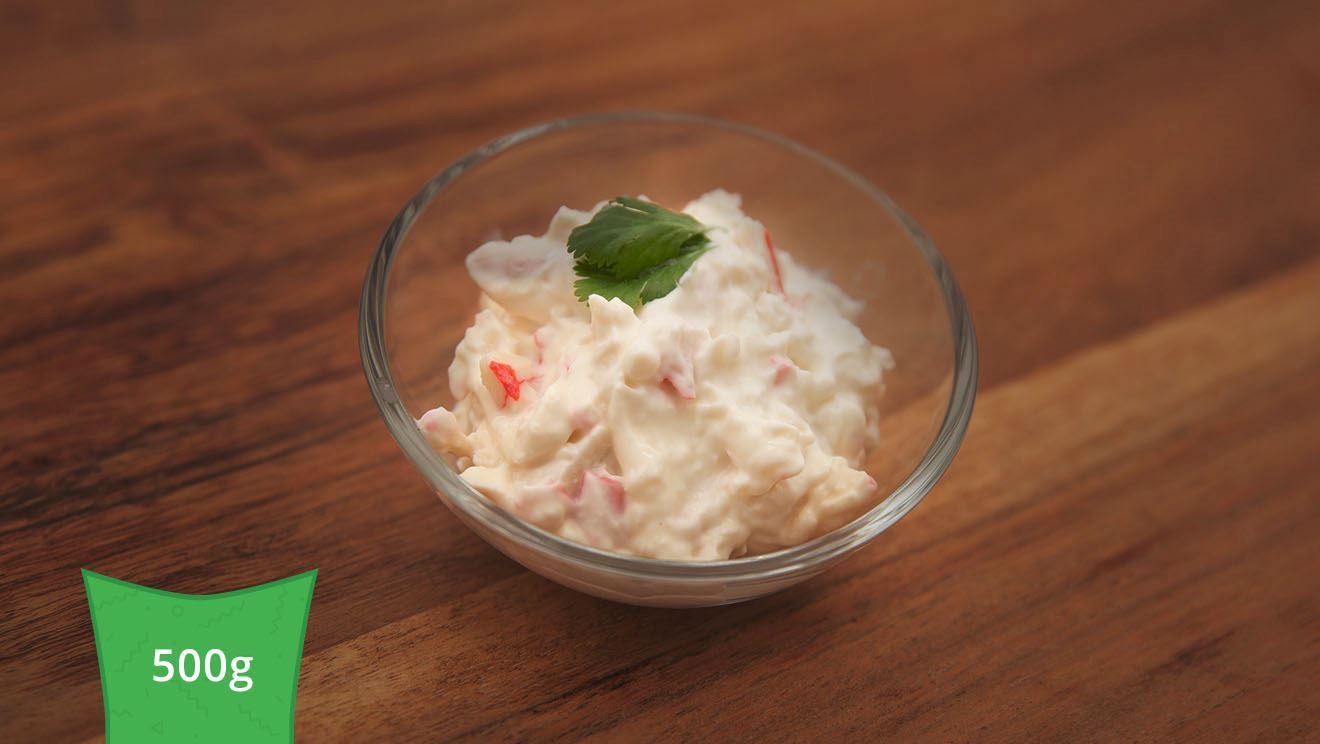 Surimi 40 % [voda, drcené RYBÍ maso, škrob (obsahuje LEPEK), VAJEČNÝ bílek, řepkový olej, SOJOVÁ bílkovina, sůl, cukr, barviva (E171, E120, E 160c), stabilizátory (E452), karagenan, sorbitol, látka zvýrazňující chuť a vůni (E621, E627, E631) aroma], majonéza (řepkový olej, voda, VAJEČNÉ ŽLOUTKY sušené, ocet kvasný, cukr, jedlá sůl), JOGURT BÍLÝ 21%, cukr, jedlá sůl, ocet kvasný, regulátory kyselosti (citronan sodný), konzervanty (sorban draselný, benzoan sodný).