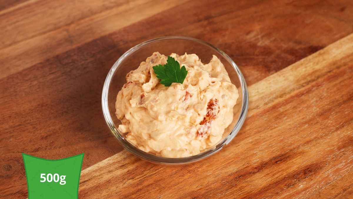 Složení: majonéza (řepkový olej, voda, VAJEČNÉ žloutky sušené, ocet kvasný lihový, cukr, jedlá sůl), TVAROH 30 %, čerstvý smetanový sýr 20 % (SMETANOVÝ SÝR, MLÉČNÁ bílkovina, sůl), sušená rajčata 17 % (sušená rajčata, řepkový olej, paprika mletá, sůl jedlá, přírodní paprikové aroma, česnek sušený), jedlá sůl, regulátor kyselosti (citronany sodné), konzervanty (sorban draselný, benzoan sodný).